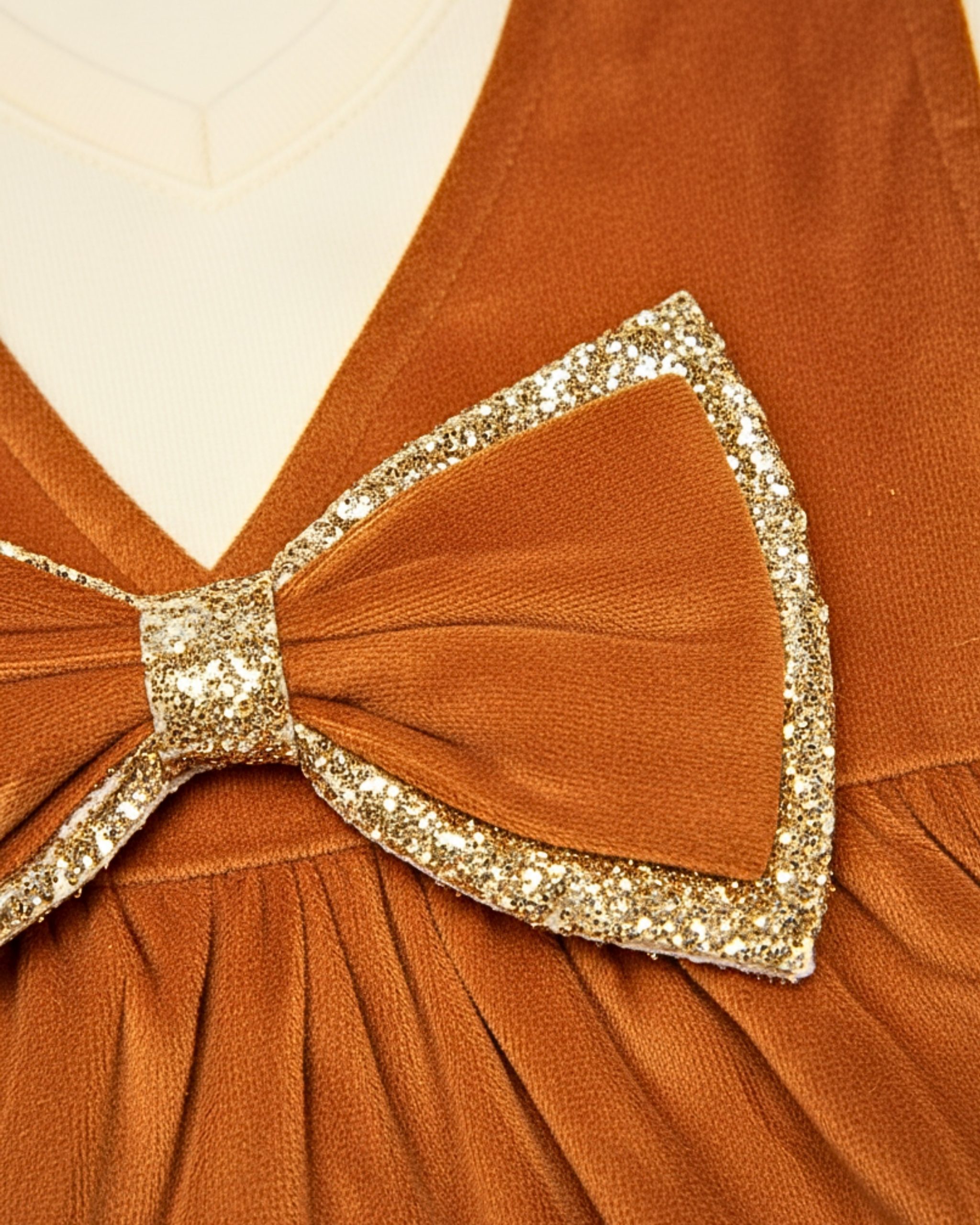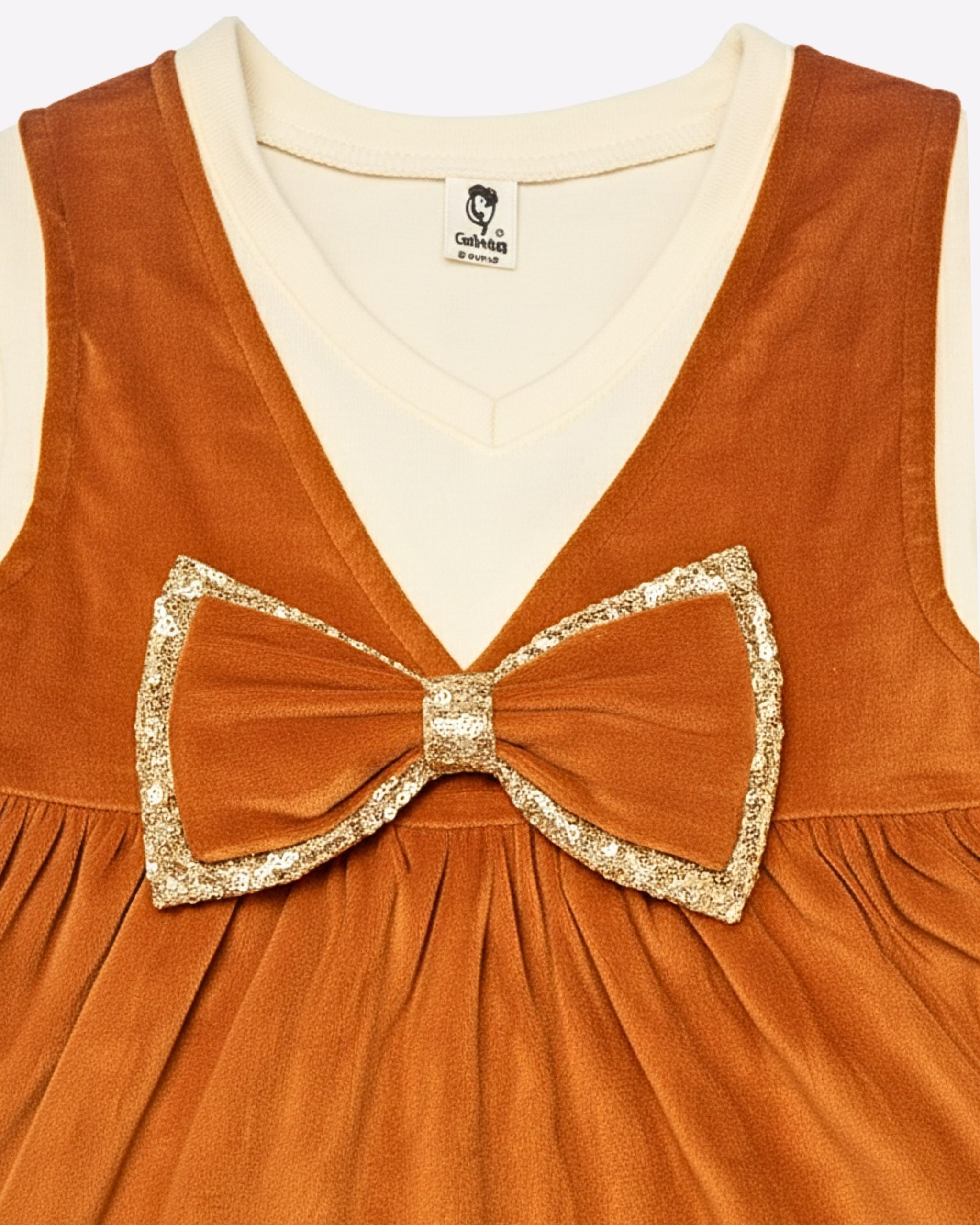 Elegant Orange Velvet Pinafore Dress with Gold Bow Accent