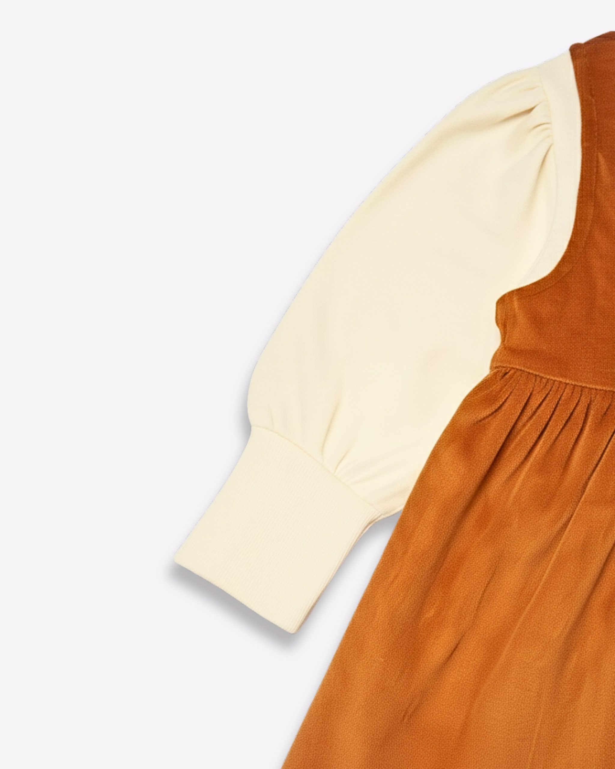 Fabric: : Soft velvet pinafore in elegant orange paired with a smooth cream blouse. Features a gold bow accent at the front, V neck bodice, and a gently flared skirt. Comfortable and gentle on delicate skin for all day wear.