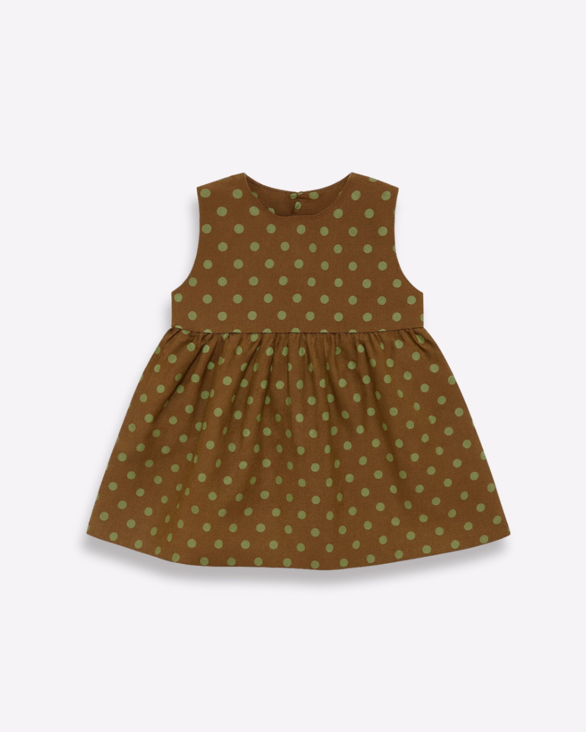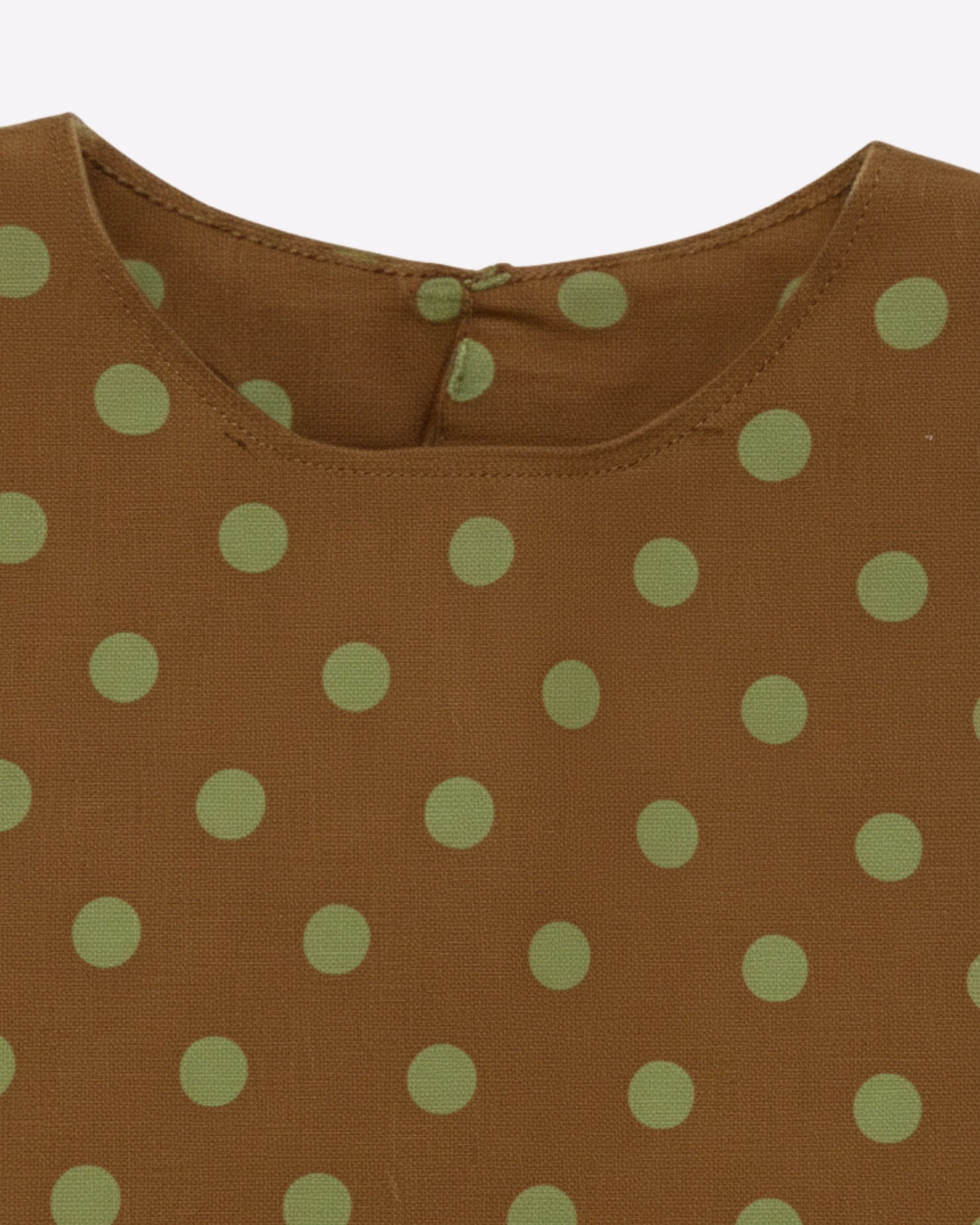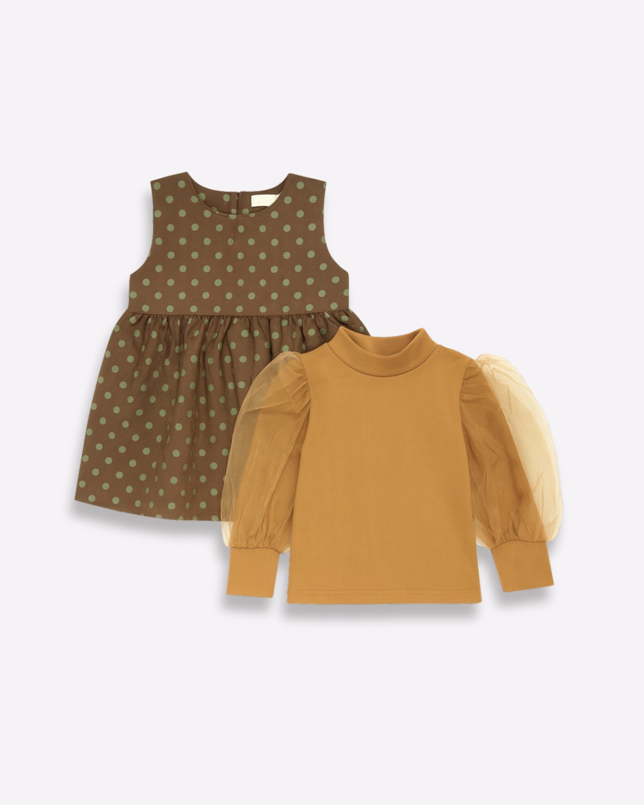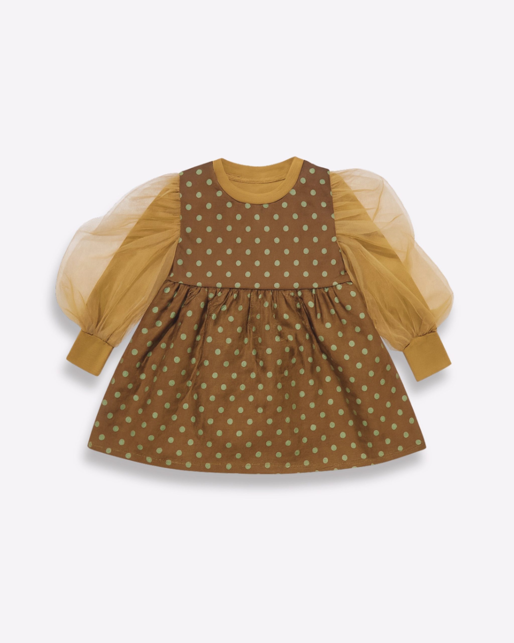 Fabric: : Soft woven dress in brown with mint polka dots, paired with sheer tulle puff sleeves and a smooth inner lining. Lightweight, comfortable, and gentle on delicate skin for all-day wear.