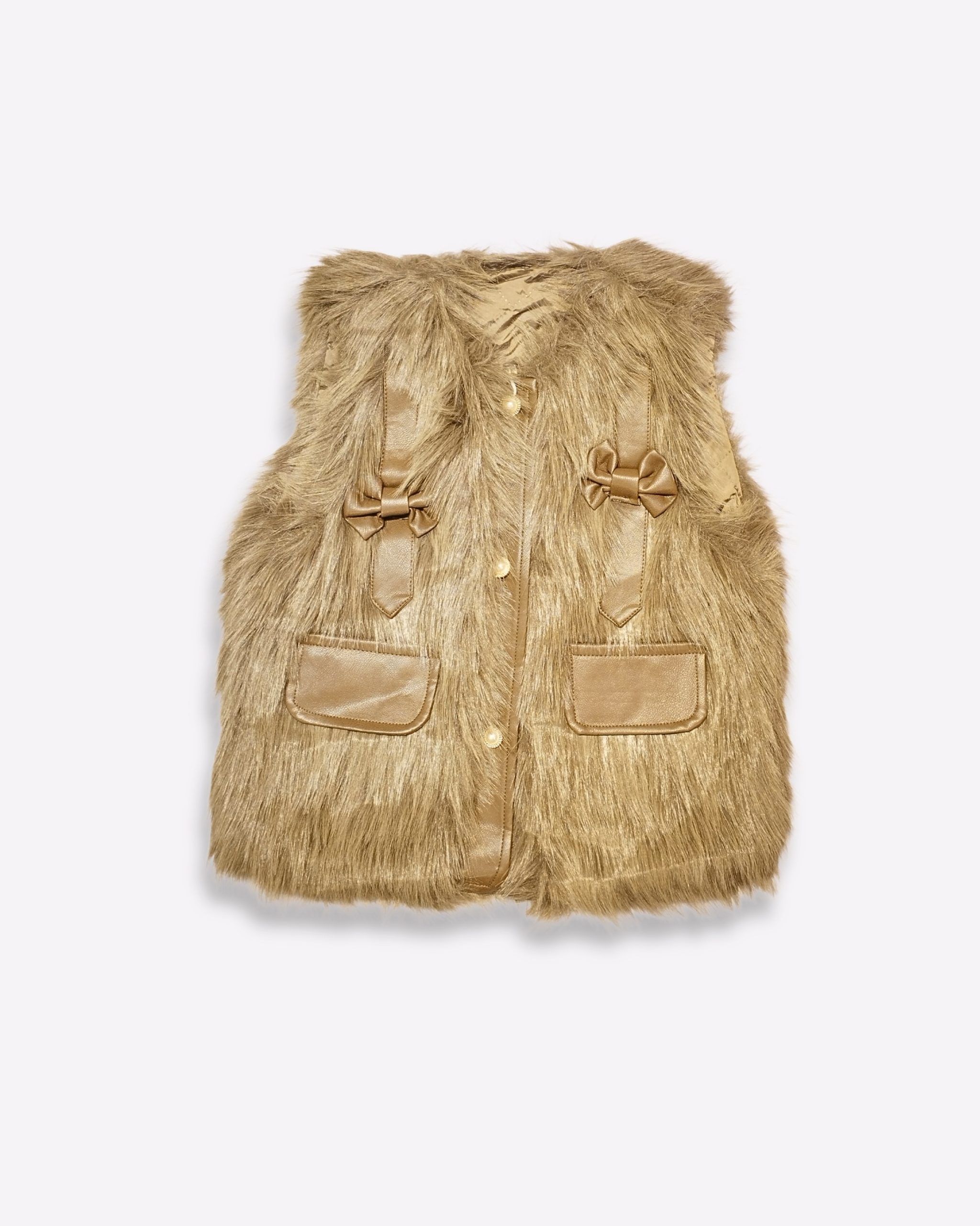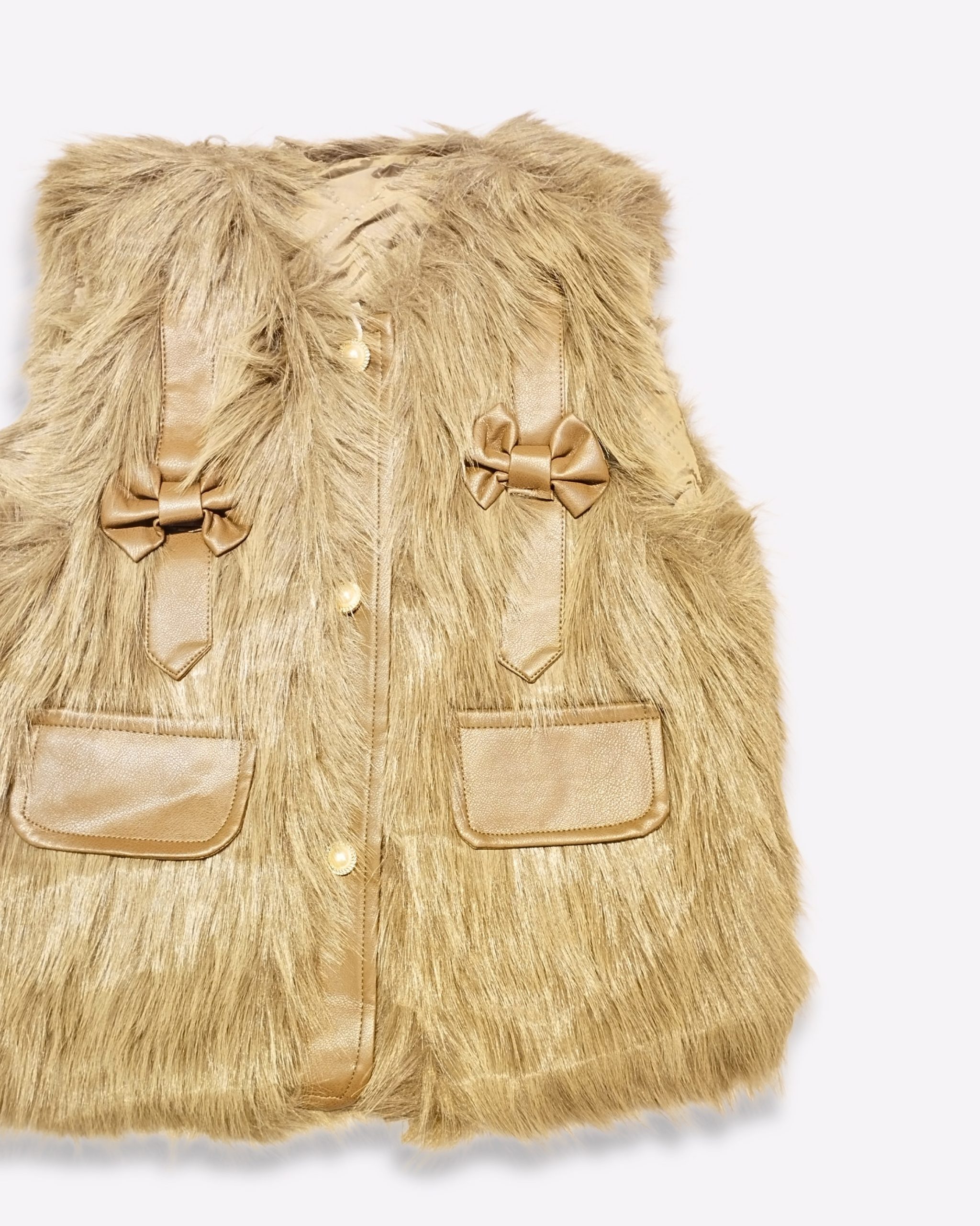 Description: Add cozy charm to cool-weather outfits with our Girls’ Rustic Brown Faux Fur Gilet with Leather Bow Detail. The sleeveless design layers effortlessly over tees, turtlenecks, sweaters, and dresses, while front snap buttons allow quick on-and-off. Two front pockets keep little essentials handy, and the bow accents deliver a refined, picture-ready finish. Ideal for park visits, playdates, school runs, family outings, and festive photos in cooler seasons.