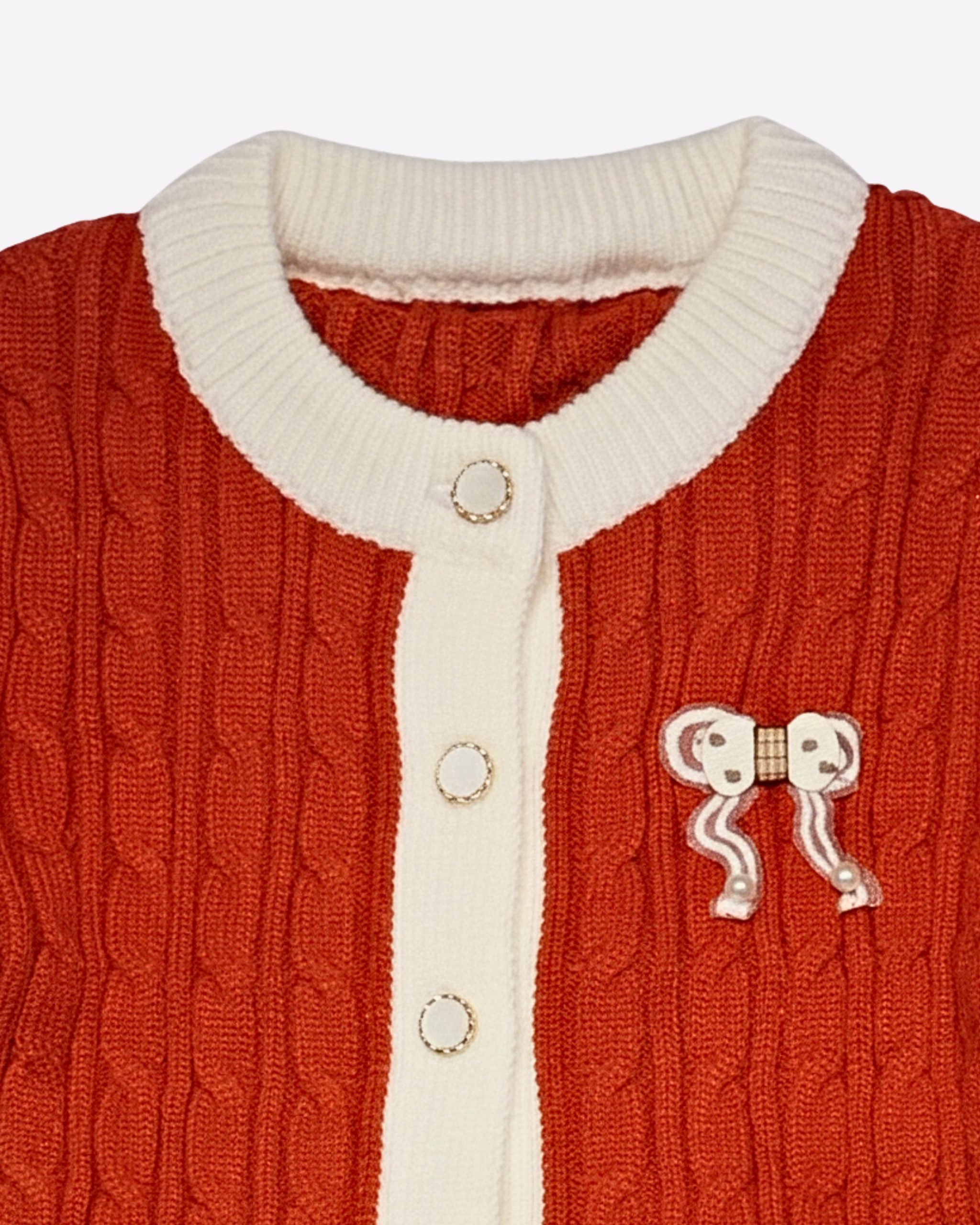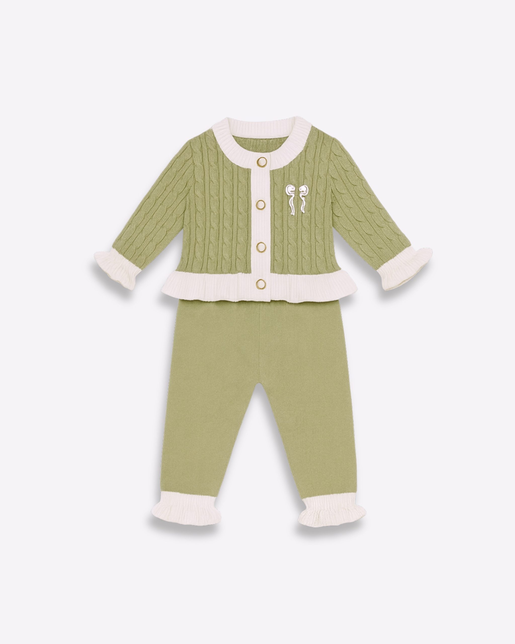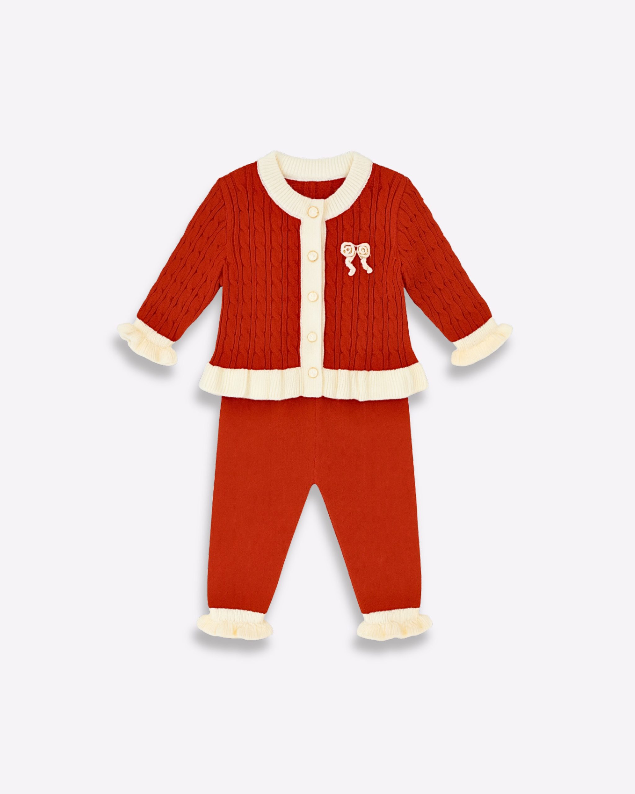 Description: Introduce festive elegance to her wardrobe with our stunning Cable Knit Cardigan and Trousers Set. This cozy two-piece baby girl outfit features a vibrant red cardigan with a classic cable knit pattern, contrasting cream trim, and sweet ruffle details at the hem and cuffs. The matching pull-on trousers complete the look, ensuring head-to-toe warmth and style. Perfect for holiday photoshoots, winter gatherings, or as a premium baby gift, this set combines high-end charm with all-day comfort for your infant or toddler girl. Snap up this charming ensemble and make a stylish statement!