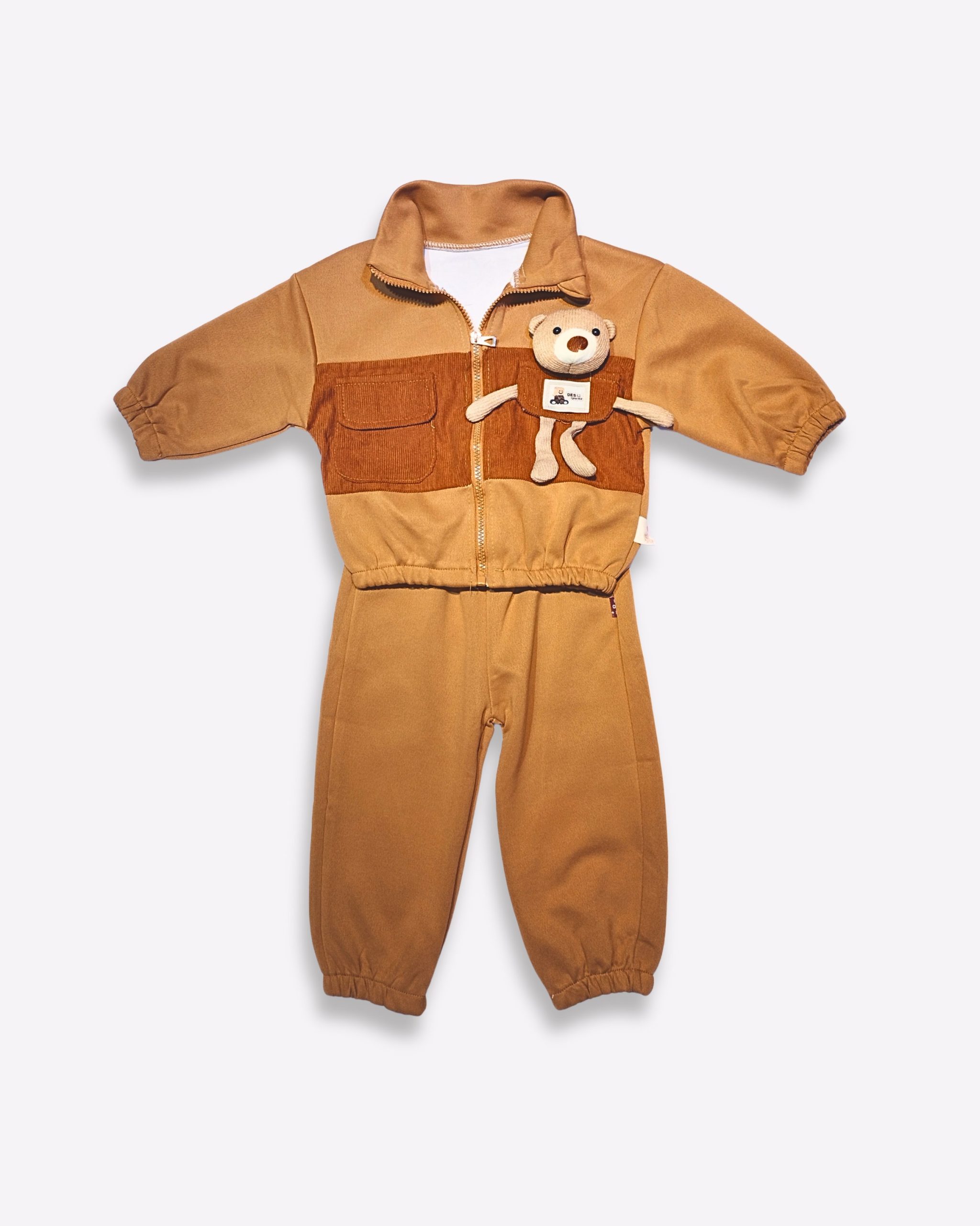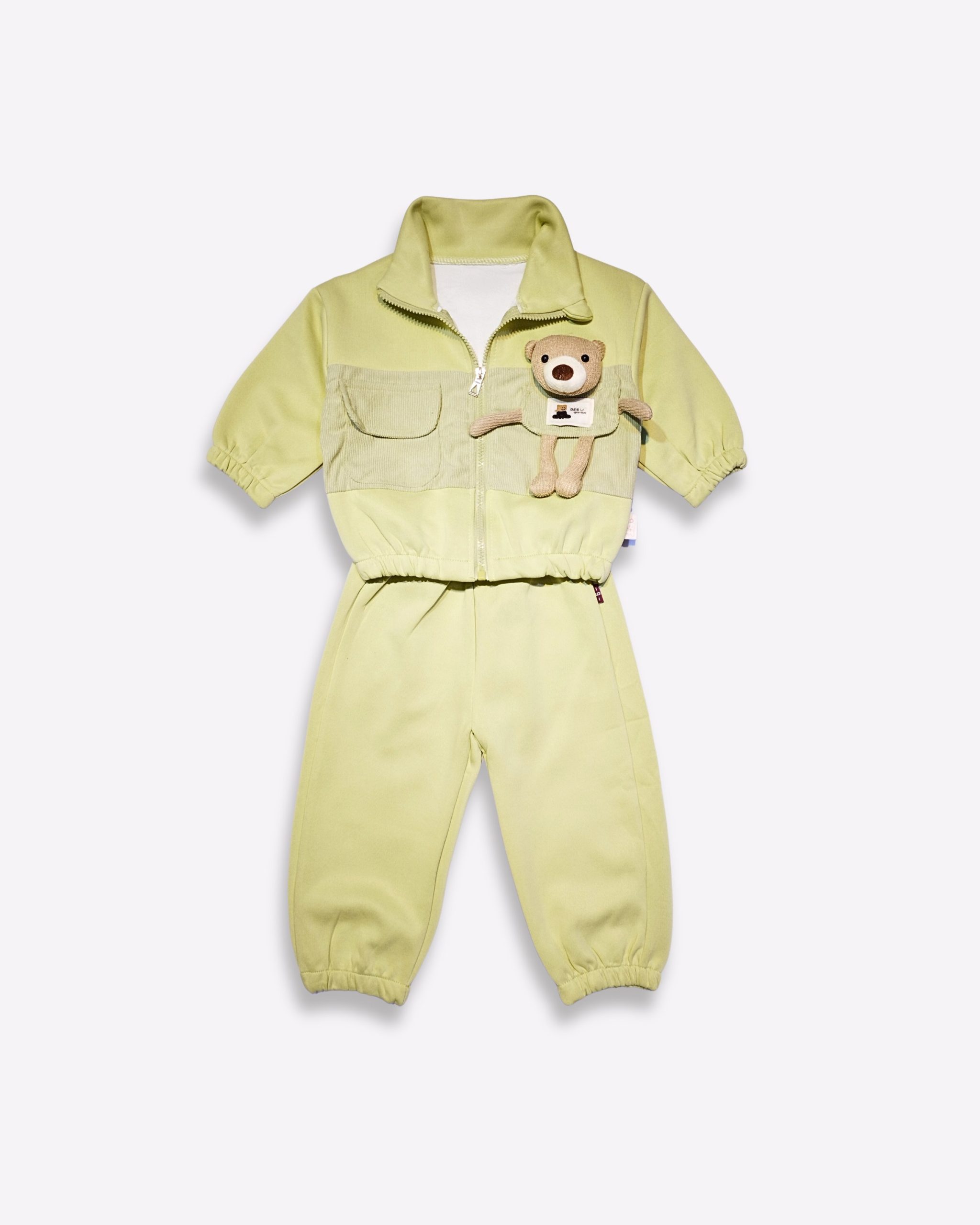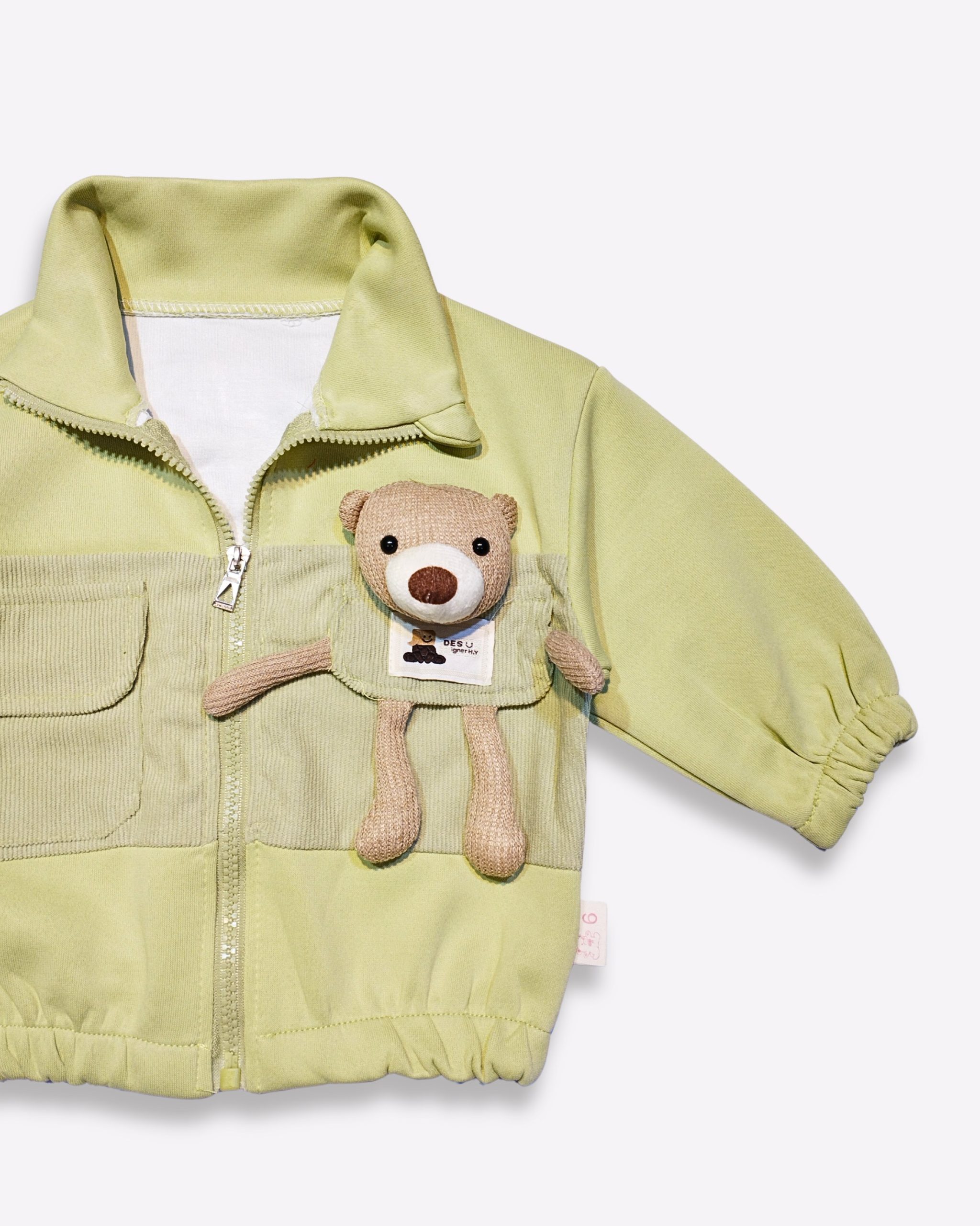 Description: Get your little adventurer ready for action with our functional and cheerful 3-Piece Tracksuit Set from Little Wink. This complete unisex ensemble features a soft zip-up jacket in a vibrant, earthy green, accented with a contrasting corduroy chest panel and an irresistible, detachable plush bear charm. The set includes matching joggers for full-body warmth and flexibility, making it perfect for toddler everyday wear, active outdoor play, and comfortable travel. Discover premium toddler tracksuit sets online at Little Wink, where cheerful style meets comfortable, high-quality fabrication.