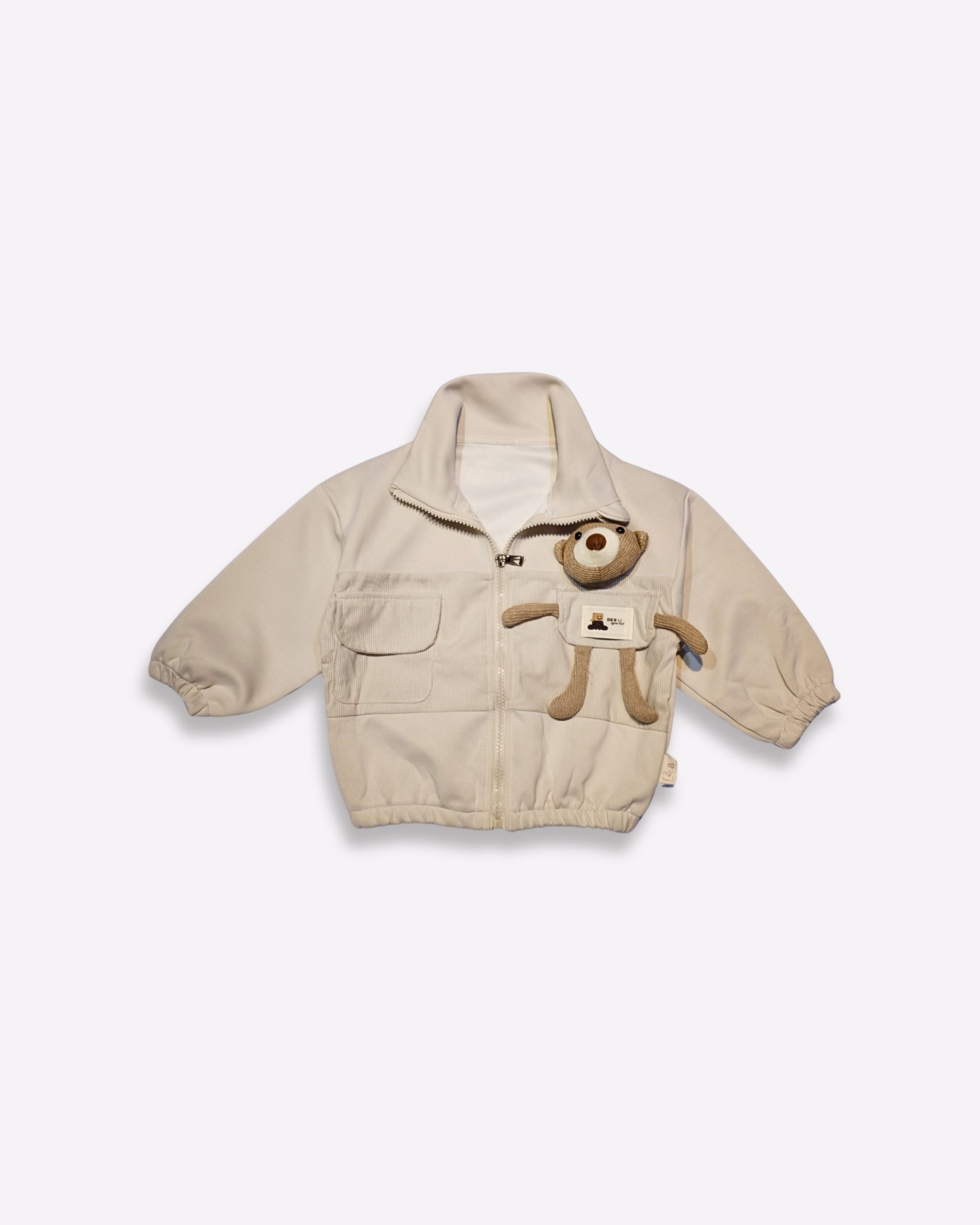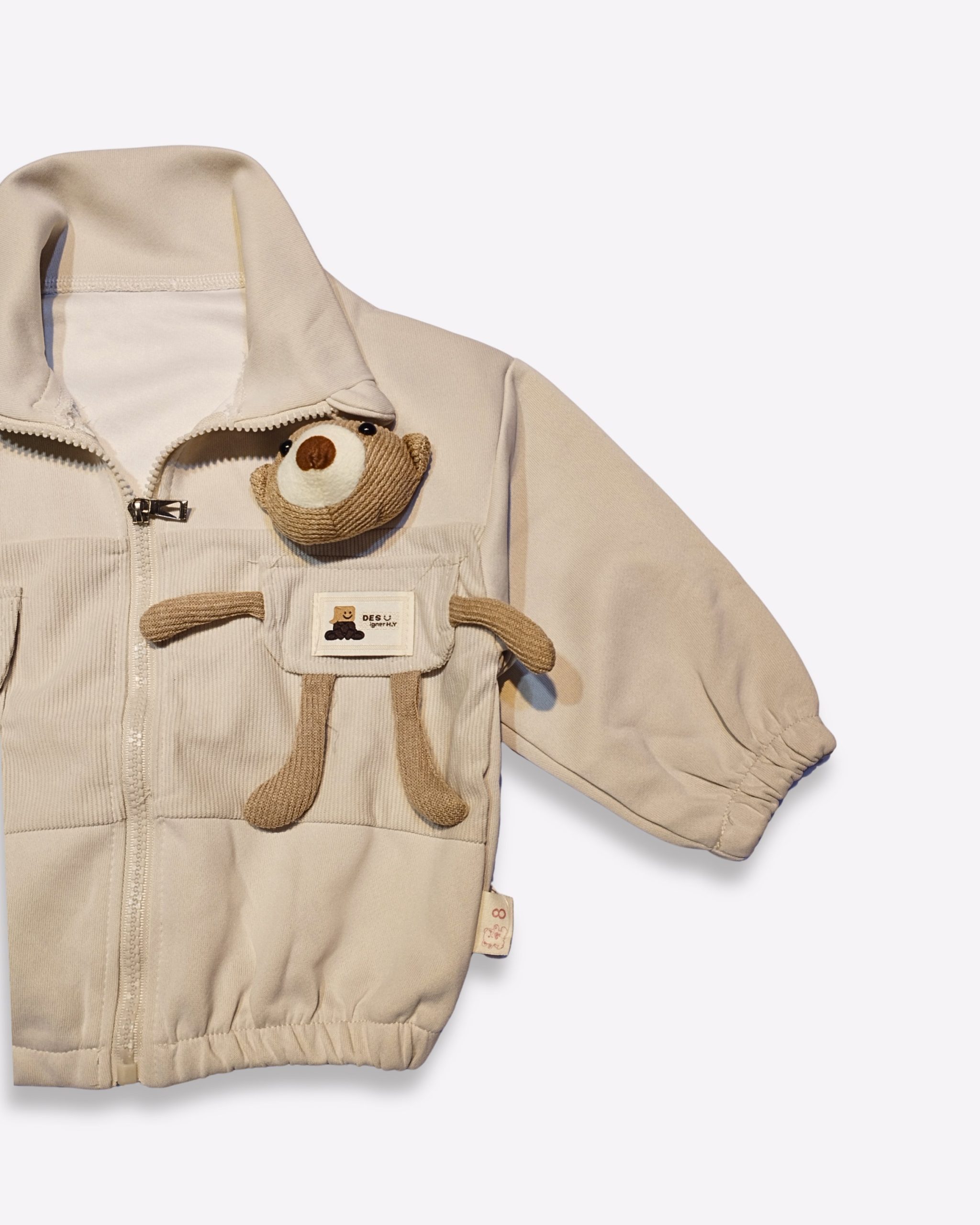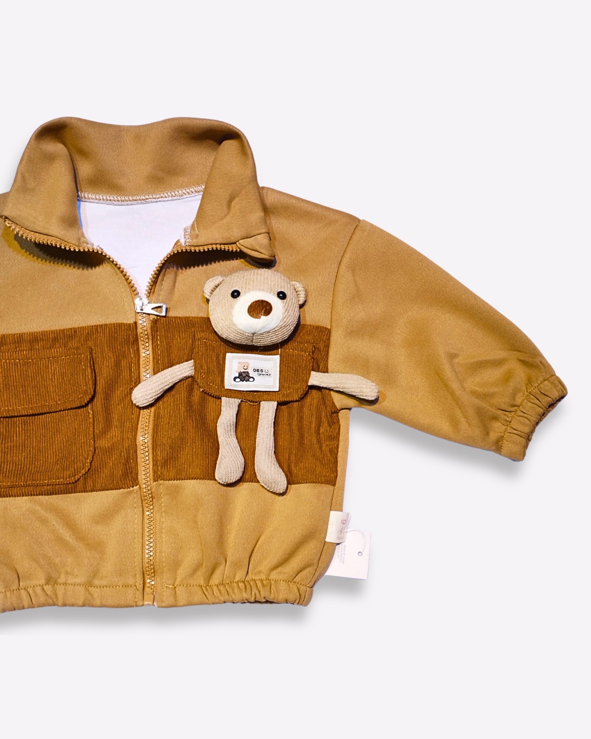 Description: Get your little adventurer ready for action with our functional and cheerful 3-Piece Tracksuit Set from Little Wink. This complete unisex ensemble features a soft zip-up jacket in a vibrant, earthy green, accented with a contrasting corduroy chest panel and an irresistible, detachable plush bear charm. The set includes matching joggers for full-body warmth and flexibility, making it perfect for toddler everyday wear, active outdoor play, and comfortable travel. Discover premium toddler tracksuit sets online at Little Wink, where cheerful style meets comfortable, high-quality fabrication.